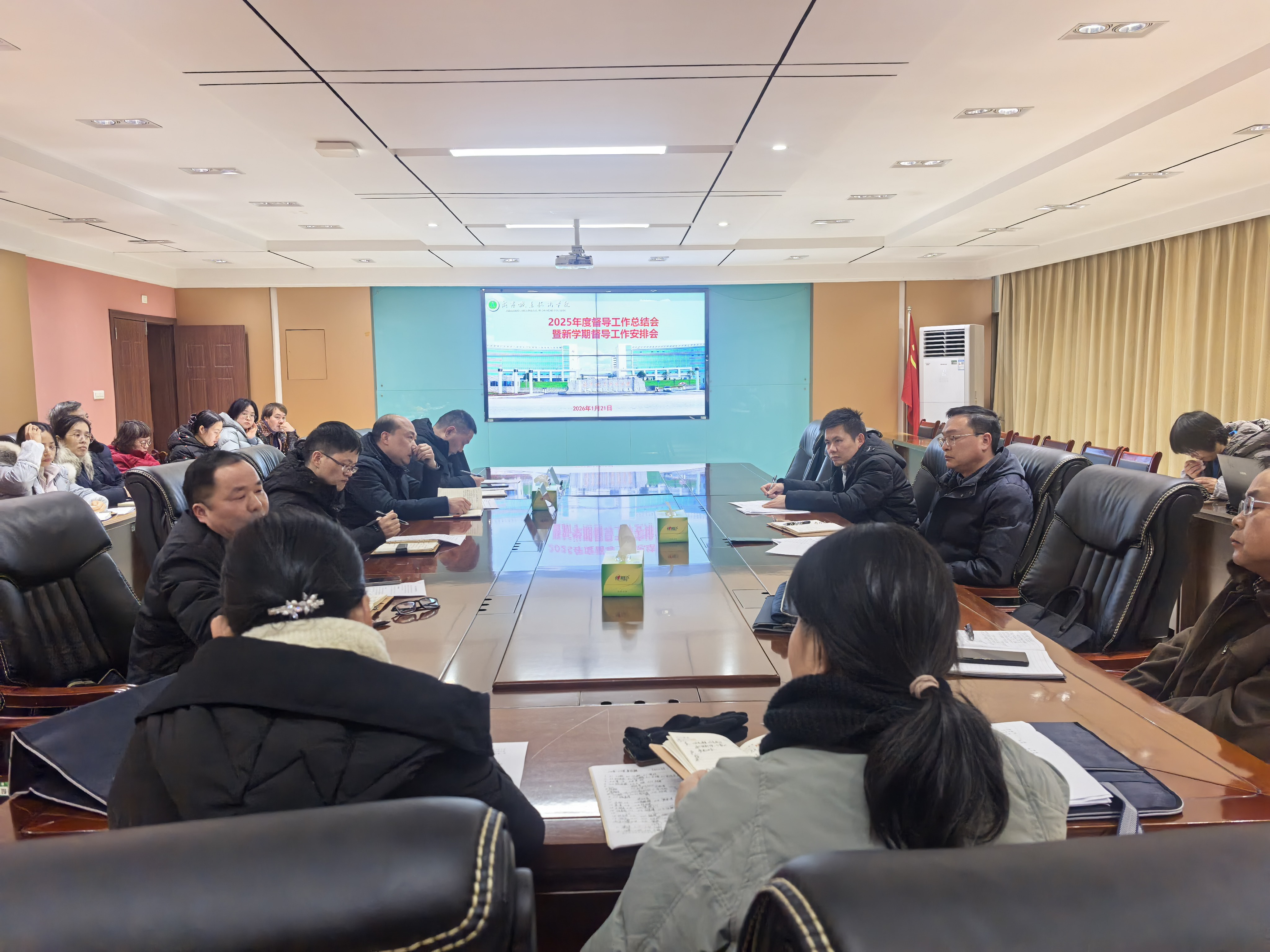 23 | 2026-011月21日下午,学校在厚德楼308室组织召开2025年度教学督导工作总结会暨新学期督导工作安排会,副校长方高文出席会议并讲话。学校专兼职督导、各二级院部教学院长、教务处及发展规划与质量管理处相关人员参加会议。会议由发展规划与质量管理处处长汪耀武主持。会议系统总结了上一年度教学督导工作成效,围绕“优化课堂教学组织、深化‘以学生为中心’的课堂革命”核心任务,对新一年督导工作的重点方向与实施路径进行了部署。副校长方高文在讲话中强调,教学督导是保障教学质量、推动课堂改革、服务职业本科创...