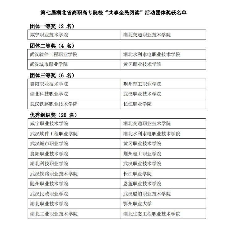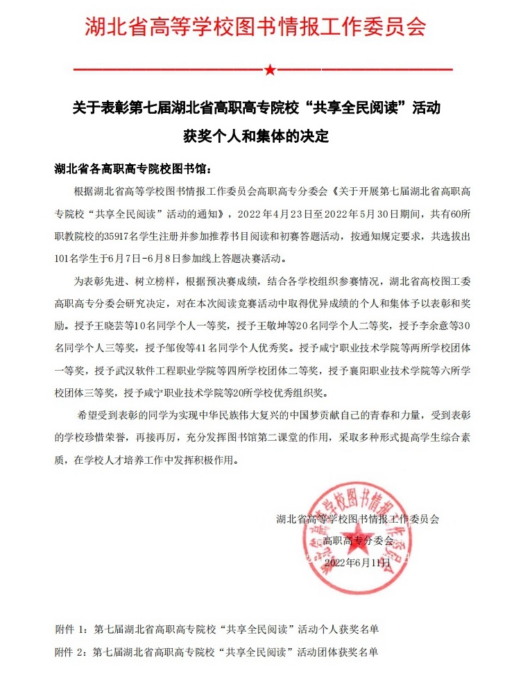 近日,我校在第七届湖北省高职高专院校“共享全民阅读”竞赛活动中荣获团体一等奖、优秀组织奖,参赛学生获个人一等奖1名,二等奖2名。
