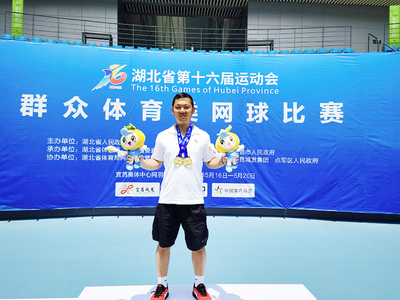 近日,湖北省第十六届运动会群众体育类网球比赛(地方组)在宜昌奥体中心举行。我校教师张宇豪作为咸宁市网球队队员,带领男子团队力压群雄,夺得团体金牌;在个人单项比赛中,夺得一枚男双金牌,创造咸宁市在省运动会网球比赛中历史最佳成绩。