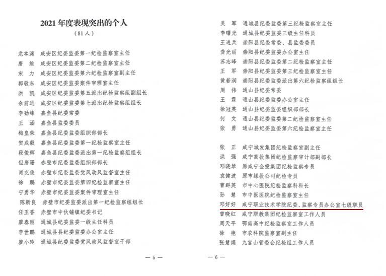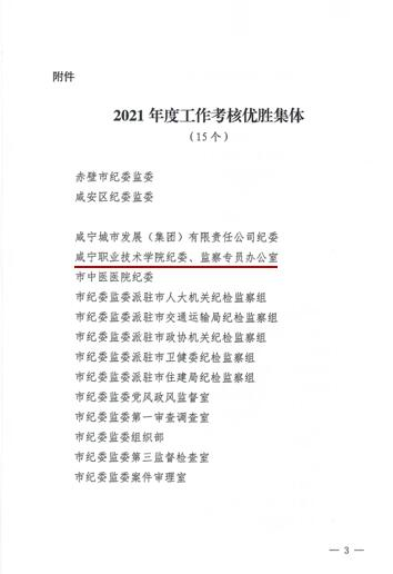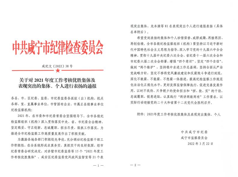 近日,咸宁市纪委下发《关于对2021年度工作考核优胜集体及表现突出的集体、个人进行表扬的通报》(咸纪文〔2022〕38号),我校纪委、监察专员办公室被评为咸宁市纪委2021年度工作考核优胜集体,邓好好同志被评为2021年度表现突出个人。