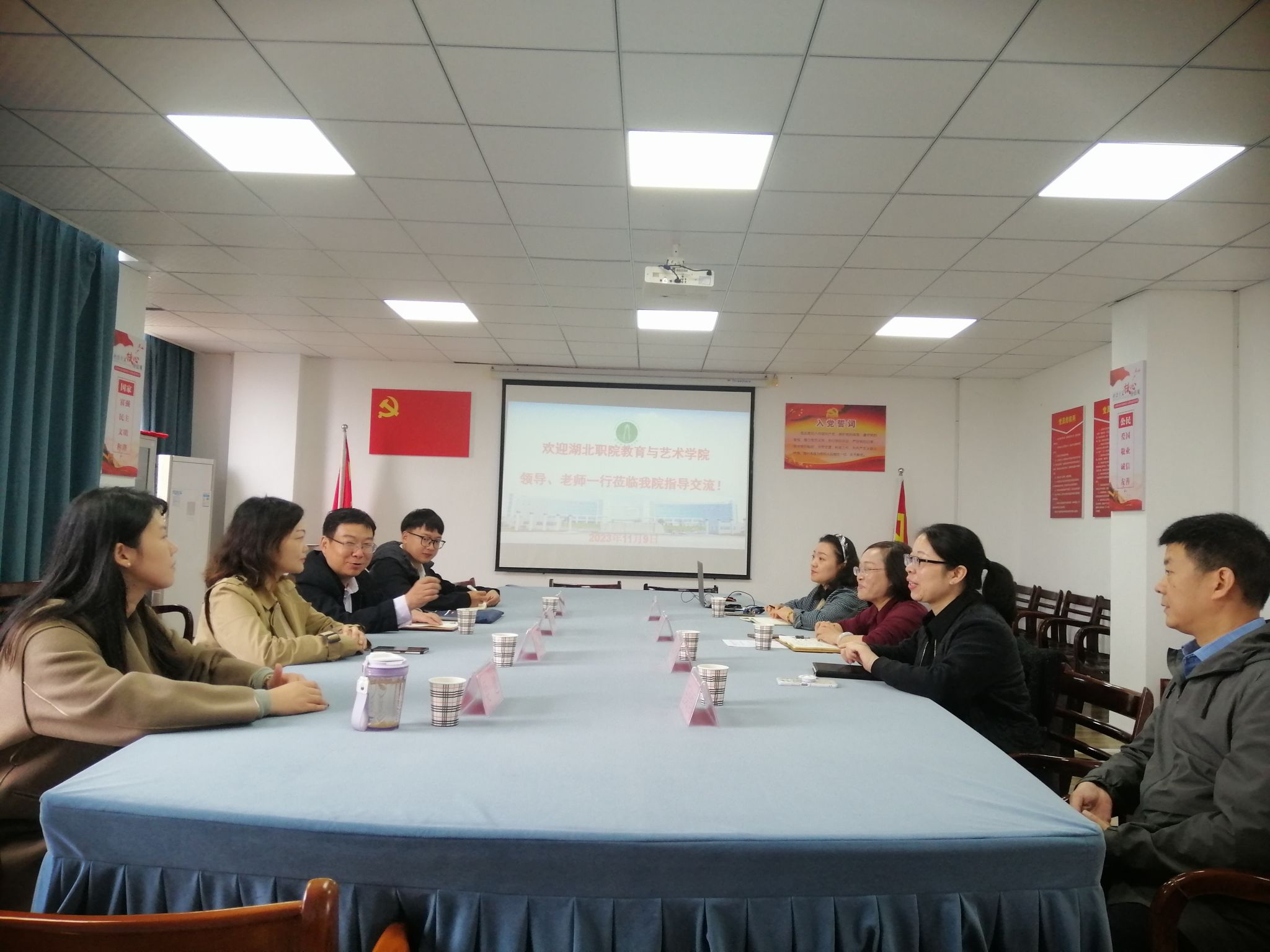 2023年11月9日上午,湖北职业技术学院教育与艺术学院院长肖成林一行5人来到人文艺术学院交流。院长余永欢、分管教学的负责人肖琼、教务科长刘飞兰、学前教研室主任谭璇、实训室主任王培恒等参加交流。