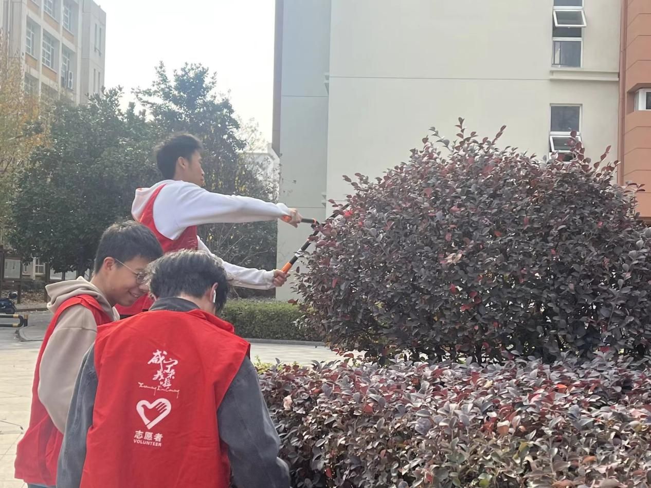 负责人孟心悦演示正确的修剪的方法,并叮嘱志愿者爱护工具,修剪完后要擦洗剪口。志愿者每3-5人一组,拿上修剪工具,由每个组长带领开始志愿修剪活动。活动期间,志愿者对绿化带内的枯枝、杂草等进行了清理,并利用手中的修剪工具对绿化苗木进行整形修剪,确保整齐美观,线条流畅。志愿者做到了随剪随清,整个工作流程井然有序,志愿者忙碌的身影成为校园里一道靓丽的风景线。