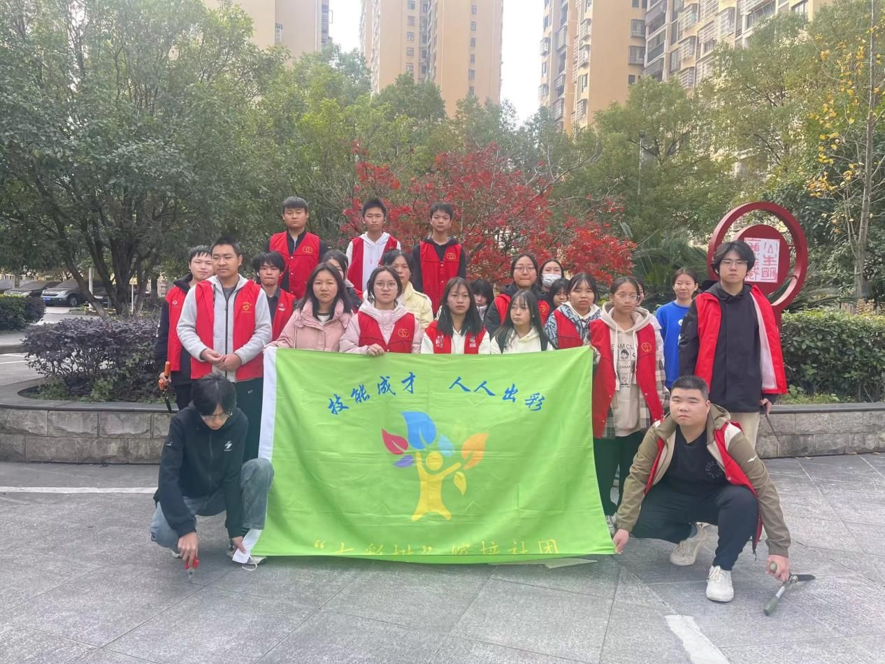 为响应建设技能校园的号召,锻炼学生动手实践能力,打造整洁优美的校园环境,11月29日“七彩树”嫁接社在校园内开展志愿修剪护绿活动。