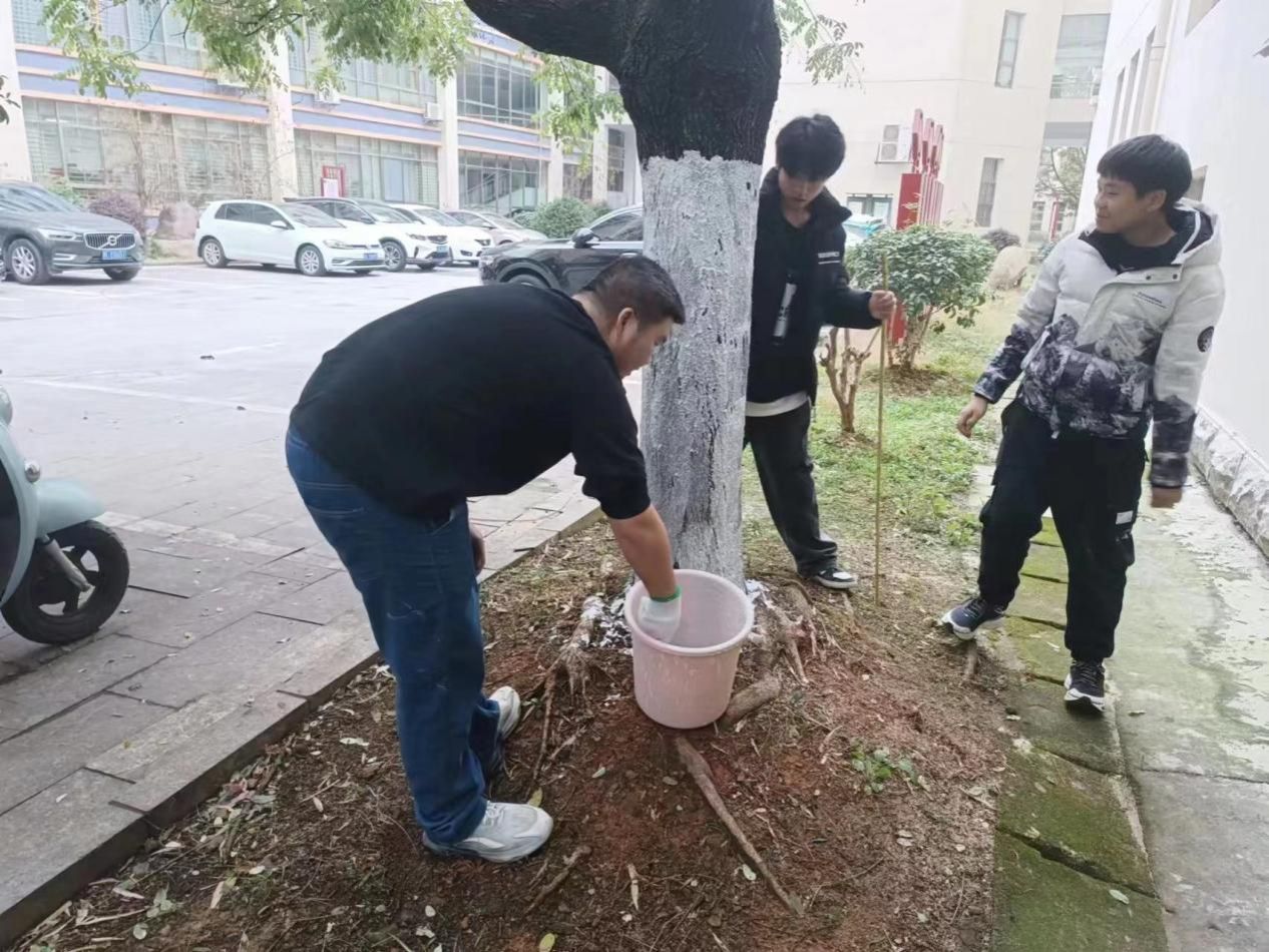 寒冬将至,为增强校园树木抗寒防冻防虫能力,确保树木安全过冬,锻炼学生的动手能力,12月13日“七彩树”嫁接社团在校园内开展志愿刷白活动。指导老师徐群刚带领全体社团学生参加。