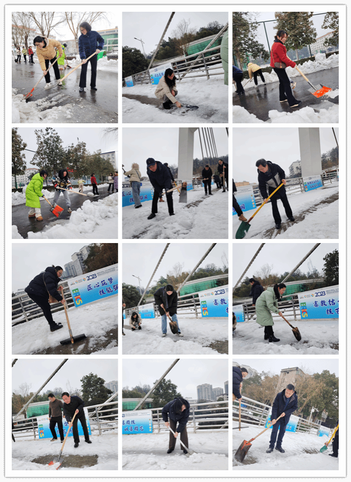 22日下午,在学院党总支书记韩飞、院长余永欢的带领下,全体教职工齐心协力,共同参与到铲雪的行动中,对大学生活动中心、A字桥、教育实训中心等责任区进行了清扫,率先行动为学生返校创造一个相对安全的环境。