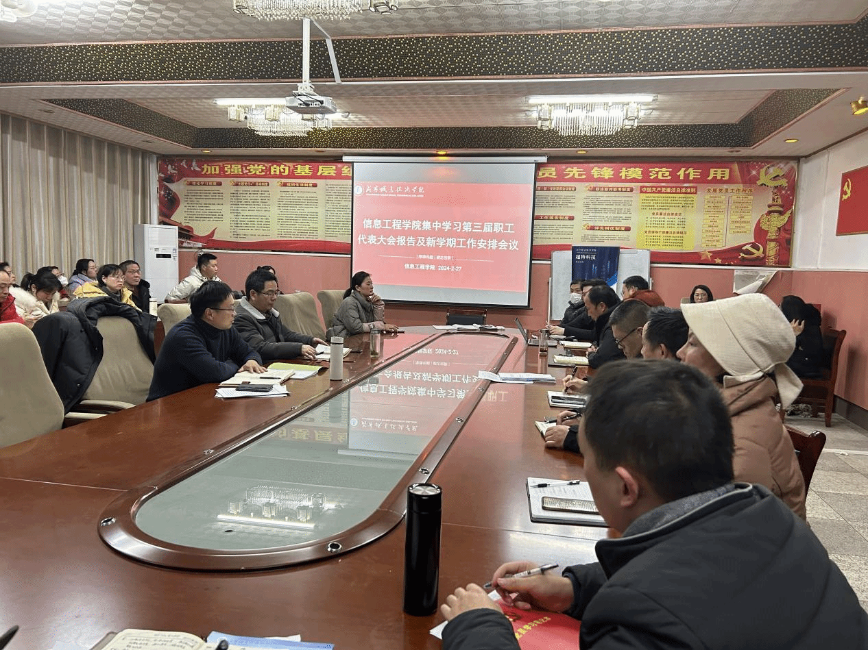 2月27日下午,信息工程学院在学院会议室召开全院教职工大会。会议以“明目标、齐思想、定举措”为主题,深入学习、贯彻学校“双代会”第三届四次会议精神,信息学院全体教职工参会,会议由院长胡文杰主持。