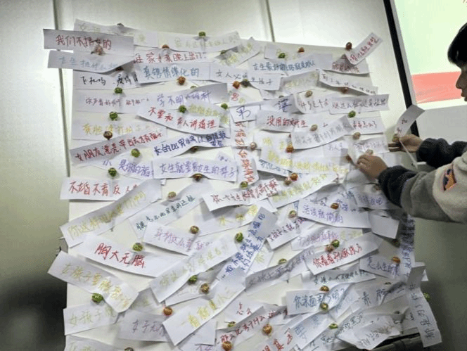 女生们看到字条,小声耳语,陷入沉思,左右张望欲言又止,然后埋头在便利贴上写下“希望的自己”,写着“低质量婚姻不如高质量单身”“ 自尊自爱自强”“女人能抵半边天”“又美又飒”等等,勇敢走上前将先前定义的小纸条撕掉,拿到糖果,将“自立自信自强”的纸条贴上,同学们报以热烈的掌声。