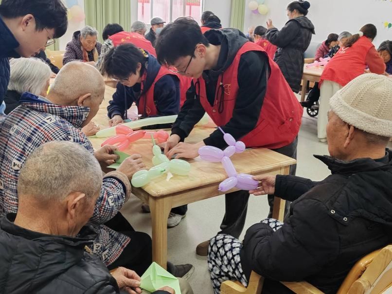 随后,志愿者们展示特长,为老人们献上合唱《我和我的祖国》、《学习雷锋好榜样》等经典歌曲,现场歌声、笑声、掌声不断,其乐融融。最后,志愿者们带动爷爷奶奶们一起做手指操、打气球、做手工,现场气氛逐渐温暖活跃。现场的老人也向志愿者们表示了感谢,并反复叮嘱志愿者们要好好学习,其关切之心令人动容。