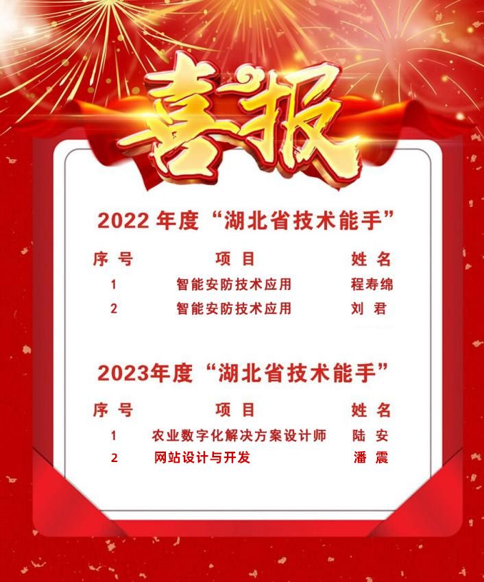 近日,湖北省人力资源和社会保障厅发布《湖北省人力资源和社会保障厅关于授予2022年度“湖北工匠杯”职业技能竞赛优秀选手“湖北省技术能手”荣誉的通报》(鄂人社函〔2024〕23 号)、《湖北省人力资源和社会保障厅关于授予2023年度“湖北工匠杯”职业技能竞赛优秀选手“湖北省技术能手”荣誉的通报》(鄂人社函〔2024〕36号),信息工程学院师生有2名教师和2名学生在“智能安防技术应用”、“农业数字化解决方案设计”、“网站设计与开发”赛项中获得优异成绩,被授予“湖北省技术能手”荣誉称号。