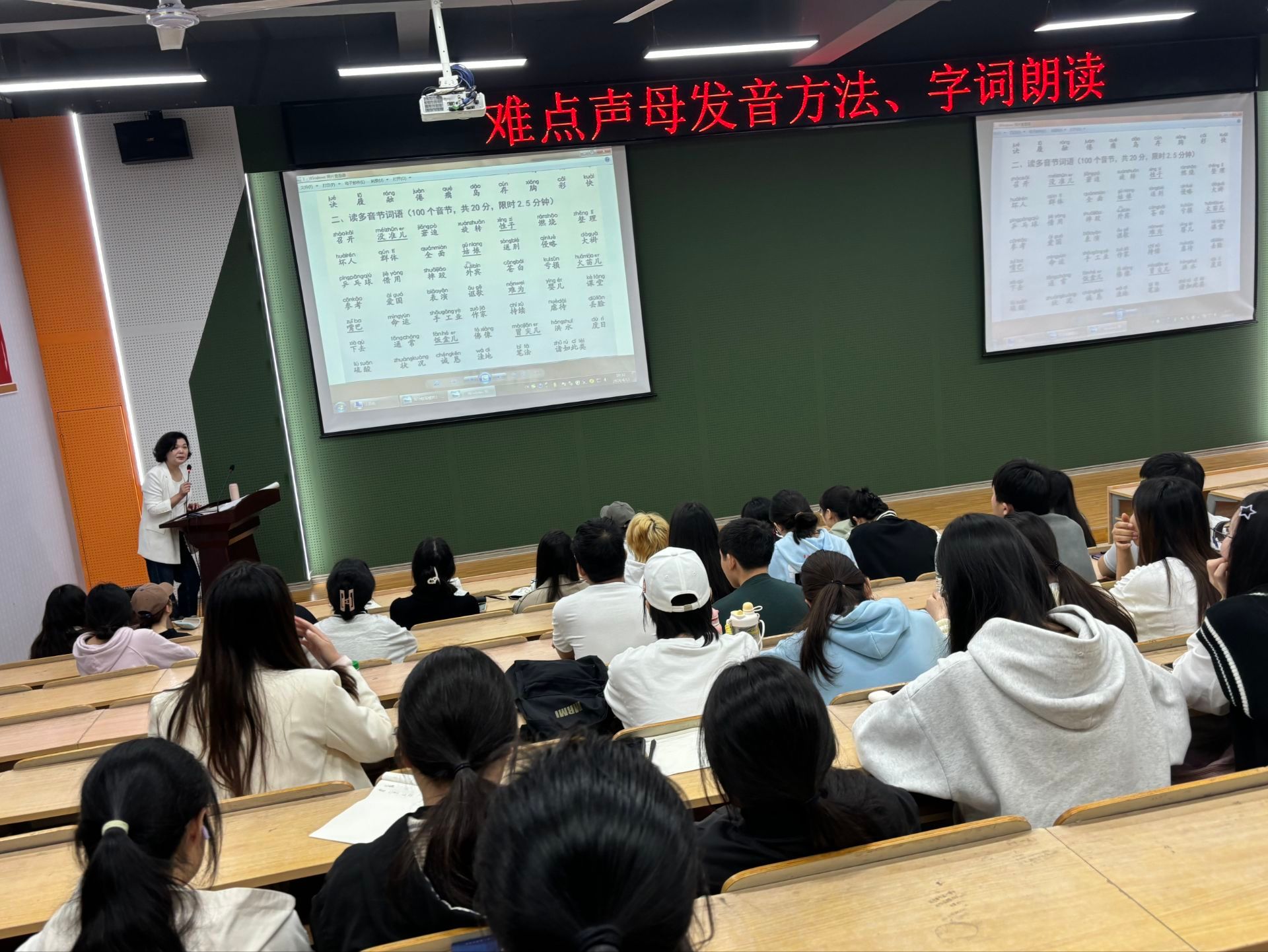 本次培训根据2024年1月1日开始执行的新版《普通话水平测试实施纲要》内容,通识教育学院组织校优秀普通话测试员针对更改的考试新内容,进行梳理编撰培训讲义及训练语料,帮助考生适应调整变化,及时补充更新知识。本次培训与师范专业日常课程教学不同,对标侧重测试题型,分字词训练、作品朗读、命题说话三个板块,通过模拟人工测试的方式,现场帮助考生查找问题,并针对其声、韵、调进行正音。通过现场测评、现场正音、示范朗读、巩固练习四个环节,指导教师逐步帮考生解决发音不规范的难题,增强参与改革后首次测试的考生信心。