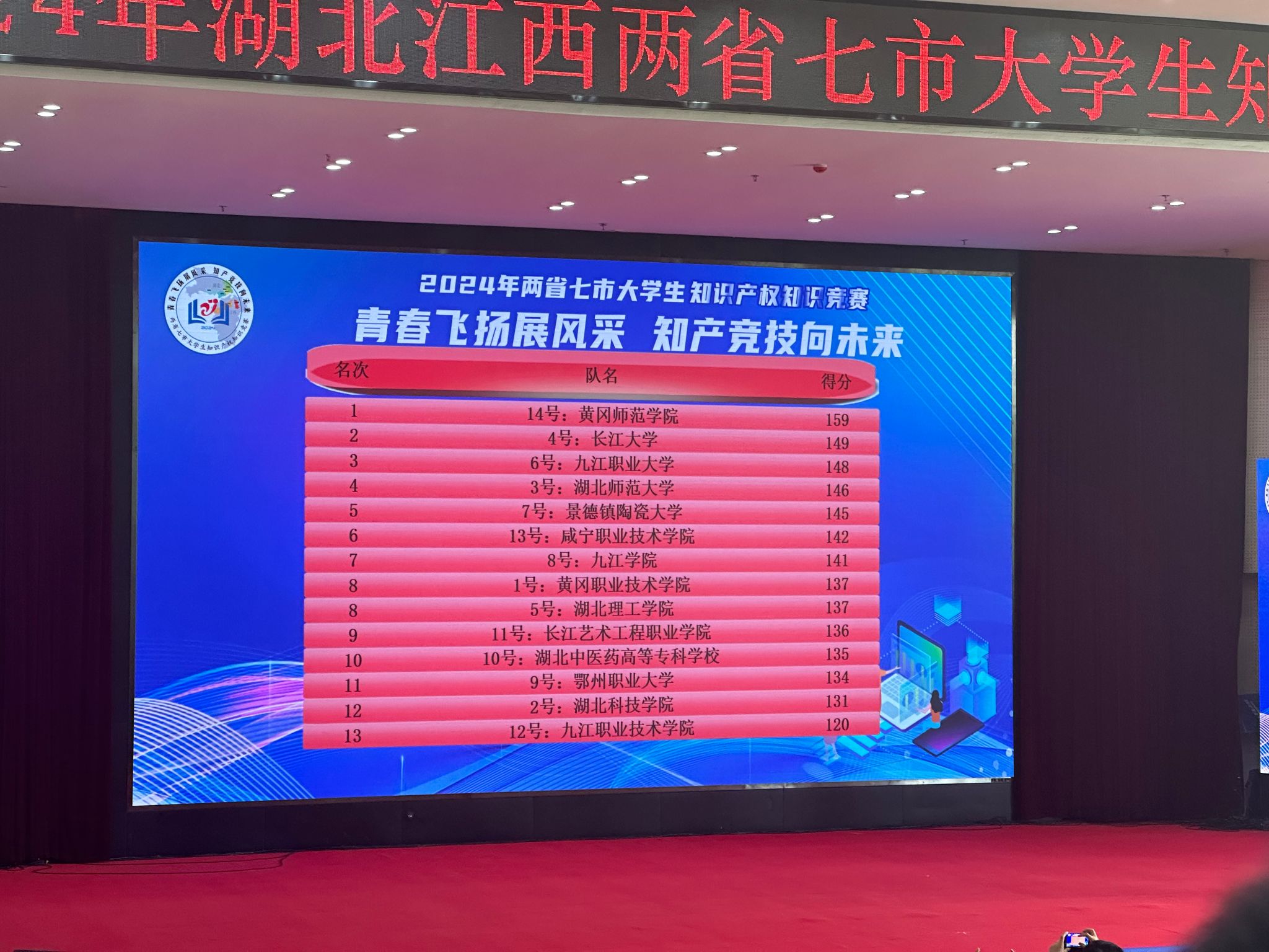 4月20日上午,2024年“两省七市大学生知识产权”知识竞赛活动在黄冈师范学院隆重举行,本次大赛的主题是“青春飞扬展风采 知产竞技向未来”。