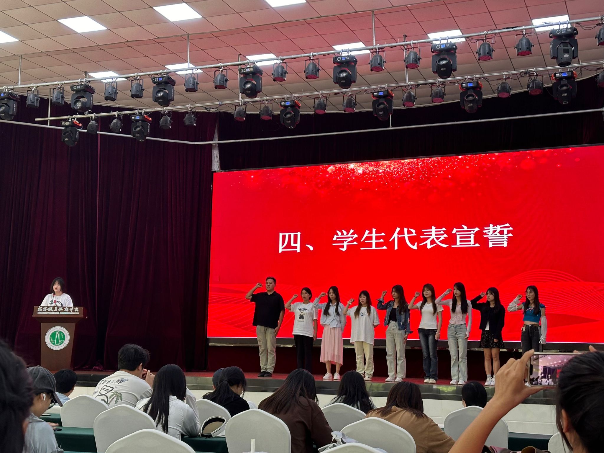 随后,三位老师分别上台领学了三个关于文明校园建设的相关文件。他们结合学院实际情况,对文件中的各项要求进行了详细解读,强调了文明校园建设的重要性,对如何进一步推进文明校园建设提出了具体建议,并宣布文明寝室名单。在颁奖仪式结束后,学生代表们上台宣誓。他们庄严承诺将积极参与学院文明校园建设,自觉遵守学校规章制度,营造温馨和谐的校园环境。他们的誓言掷地有声,展现了会计学院学子的良好精神风貌。