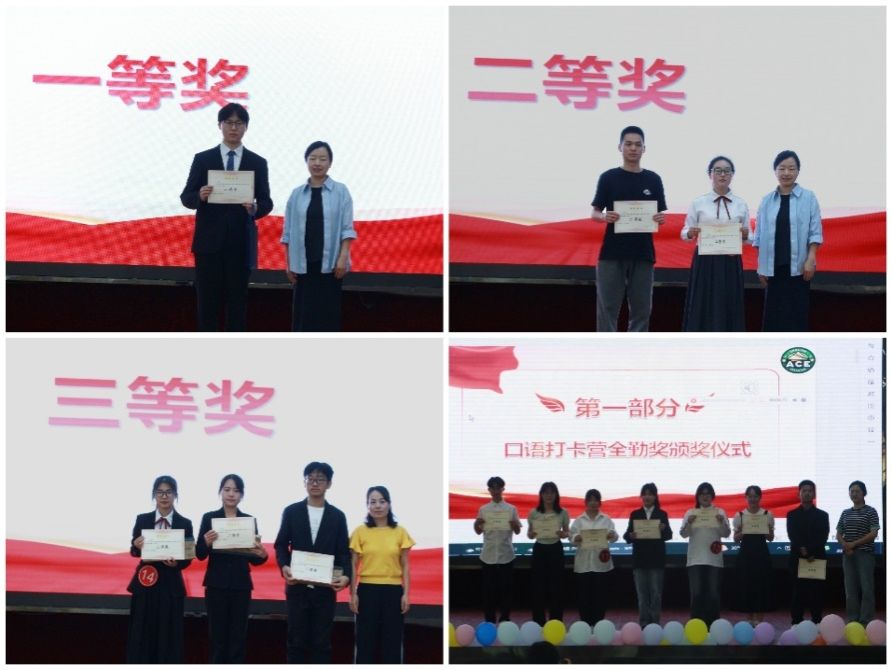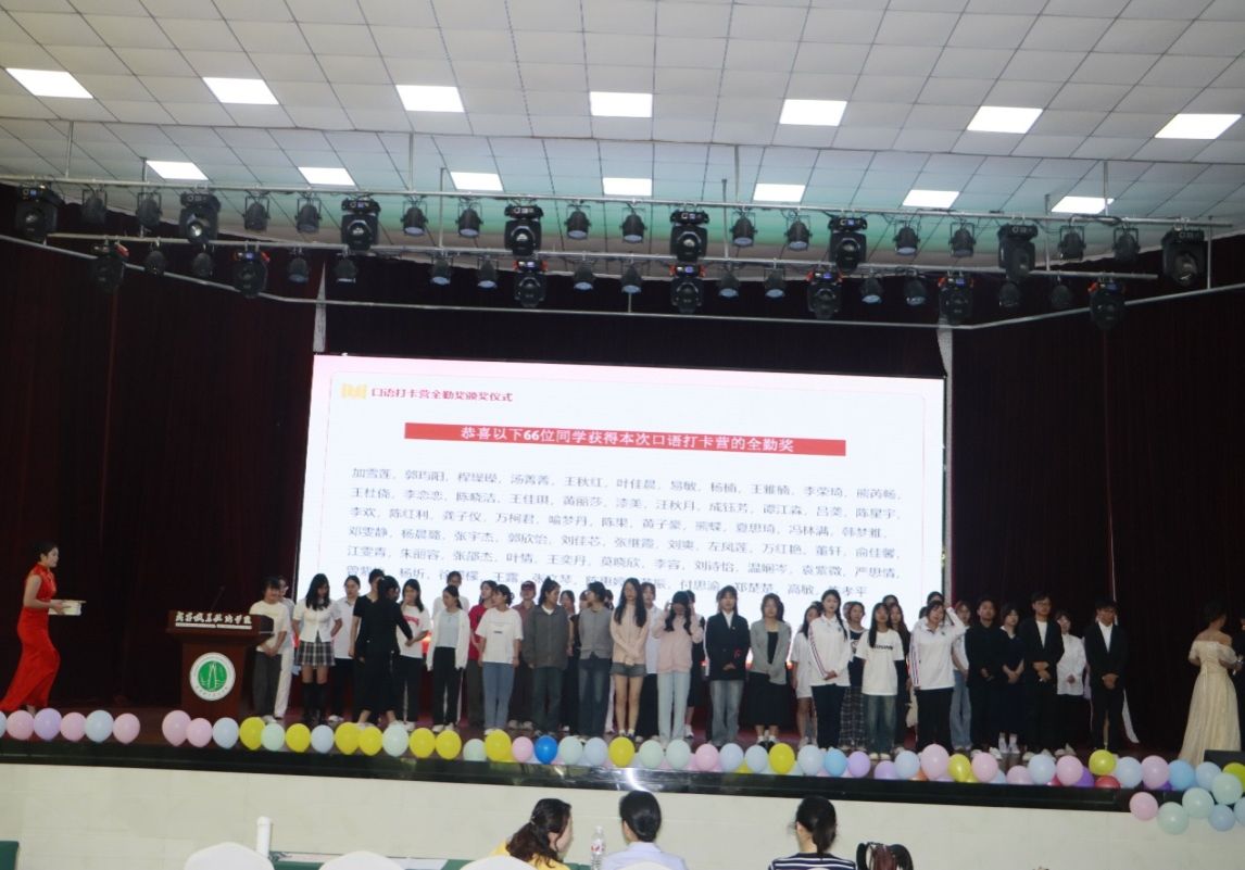 紧接着,在为期30天的“每日英语口语打卡”活动中,由四位评委老师为66位获得全勤奖的同学颁发荣誉证书以及奖品。