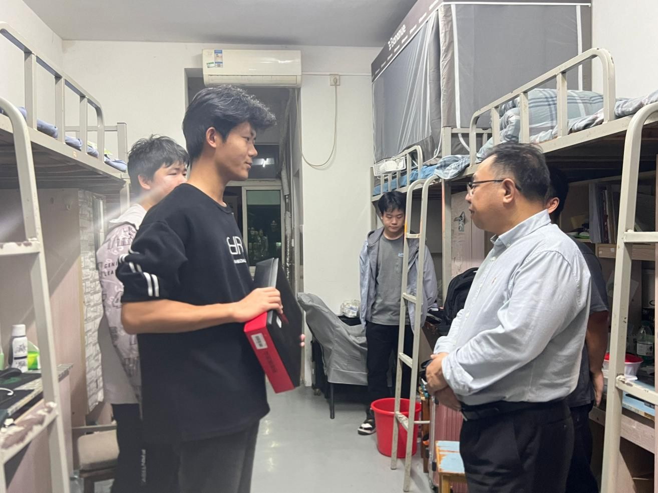 此外,吴院长还特别留意了宿舍的卫生环境。当他看到一间间干净整洁、井然有序的寝室时,他毫不吝啬地给予了表扬,并鼓励同学们继续保持这种良好的生活习惯和卫生习惯。他认为,一个整洁的环境不仅有利于同学们的学习和生活,更能够培养同学们的责任感和自律精神。