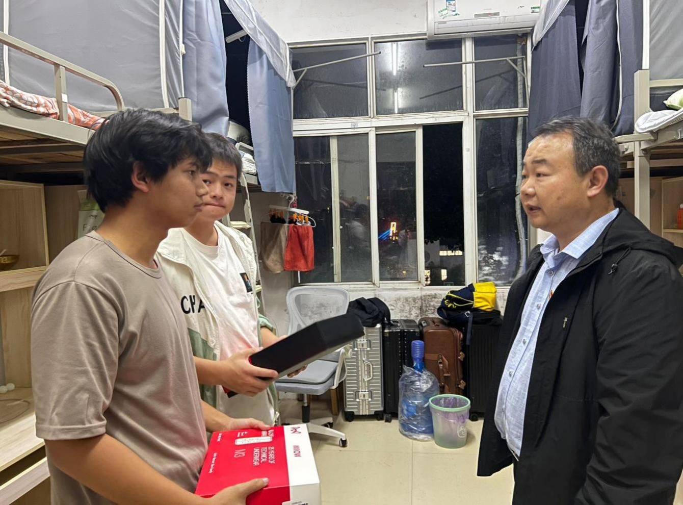 吴涛在走访过程中热情地与同学进行交谈,亲切地询问学生的学习生活情况。看到穿着单薄的同学,他一再叮嘱:“一定要注意保暖,有空的时候一定要多给家里打电话”;吴院长还发现了不少同学在寝室里刻苦学习,他对此表示了高度的赞赏,并与他们进行了深入的交谈,询问他们的学习计划、学习方法以及未来的职业规划。吴院长的话语中充满了鼓励与期待,激励同学们继续努力学习,追求卓越。
