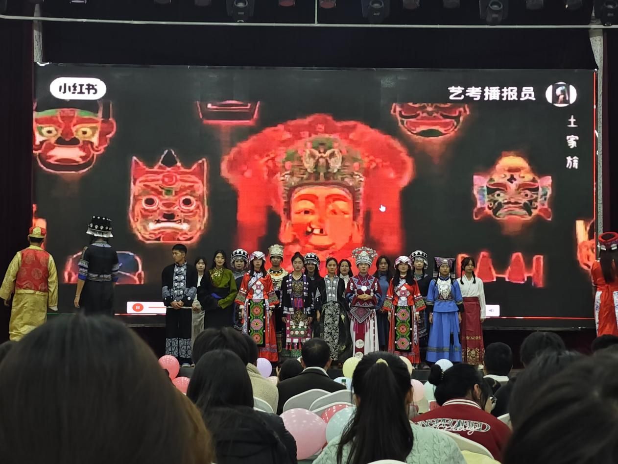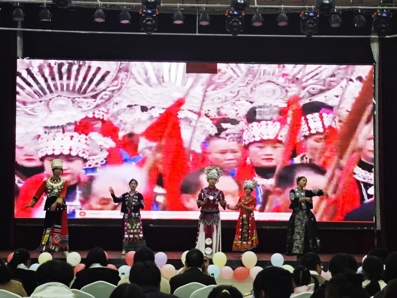 随后,一场别开生面的民族服装秀拉开了序幕,各民族的同学身着各自民族的传统华服,璀璨夺目。苗族舞蹈《弥渡山歌》轻盈灵动,土家族的《摆手舞》质朴粗犷,维吾尔族舞蹈《欢乐地跳吧》欢快热烈,藏族舞蹈《欢聚》庄严神圣,生动展现了各自民族的独特魅力与风采。最后全体师生合唱《爱我中华》,生动诠释了“56个民族是一家”的美好,大家手握手、心连心、同呼吸、共命运,彰显了中华民族强大的凝聚力和向心力。
