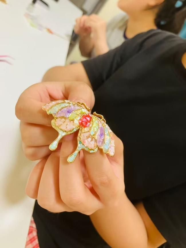 在老师的指导下,大家拿起镊子,小心翼翼地将贝壳薄片镶嵌在素胚上。贝壳特有的光泽与斑斓色彩,随着指尖的移动渐渐勾勒出心中的愿景 —— 有人拼出展翅的蝴蝶,有人描绘静谧的竹子。在专注的创作中,压力悄然转化为指尖的艺术,每一片螺钿都承载着对美好的期许。