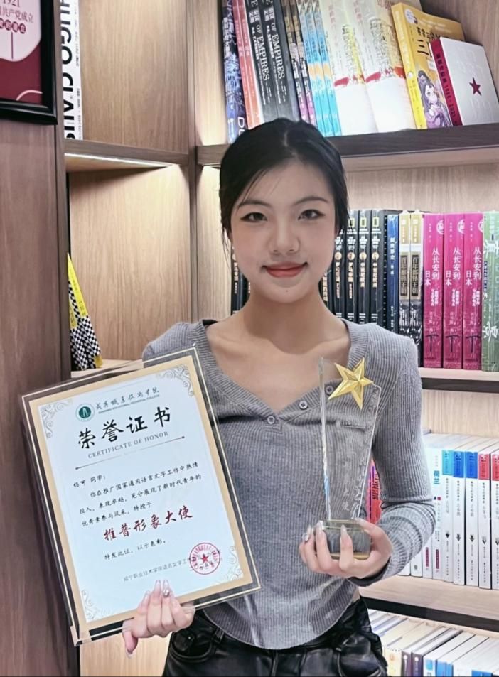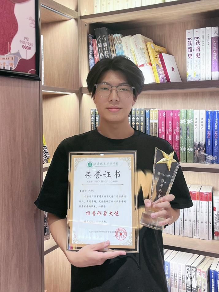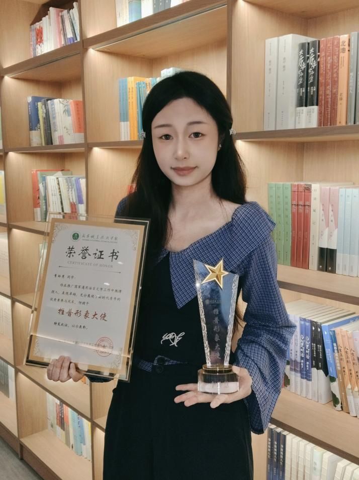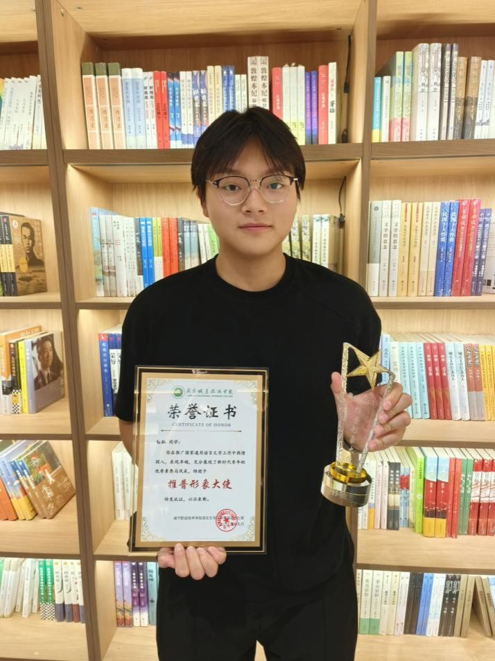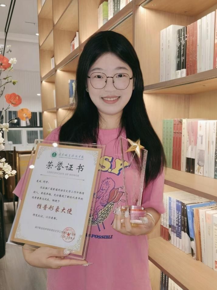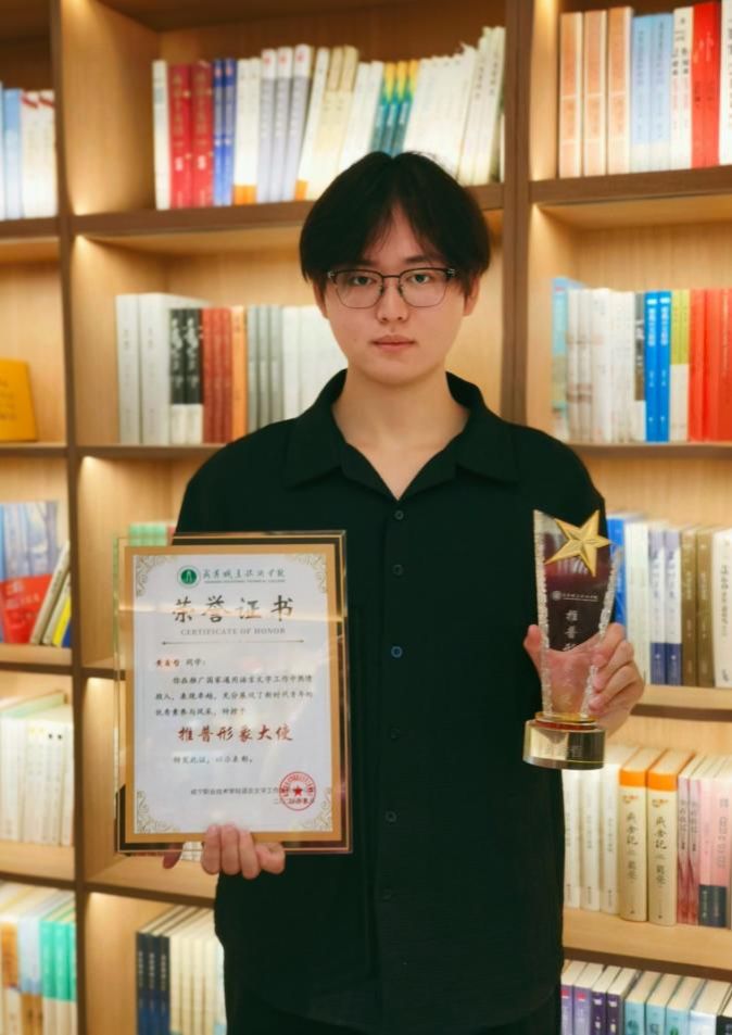 主要事迹:担任语言文字工作者协会会长期间,积极参与学校“典耀中华”品牌建设,组织开展了语言培训、经典诵读、阅读分享等学生活动40余场,带领团队获评“优秀社团”,个人获评“优秀会长”、“文艺之星”。语言类竞赛中屡获佳绩,曾获第七届“咸职故事”大赛一等奖、2024年科普讲解大赛一等奖等多项荣誉。署名发表推普新闻稿件40余篇,多篇文章被中青网、中华网、教育部中华经典诵读工程、大学生云报、湖北日报、湖北电视教育频道、湖北高校思政网等主流媒体和官方平台刊载,有效扩大了学校推普工作的社会影响力。连续两年暑期奔赴乡村基层,参与“推普助力乡村振兴”社会实践,展现了新时代青年的责任与担当,是学校推普工作的杰出青年代表。