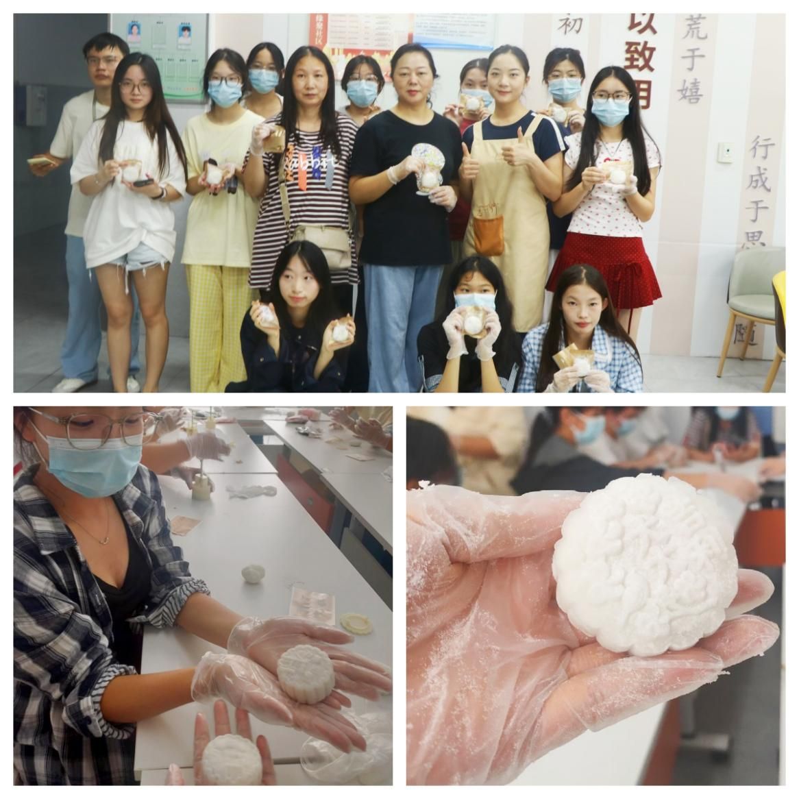活动现场暖意融融,冰皮月饼制作现场社区辅导员老师早已备齐面粉、馅料、模具等制作材料,手把手示范揉面、包馅、压模的完整流程。在老师的指导下,同学们分工协作、互相支招,不一会儿,印有“中秋”“团圆”字样的月饼便新鲜出炉,细嫩的外皮裹着香甜的内馅,浓郁的饼香在活动室里弥漫,满是团圆的温情。