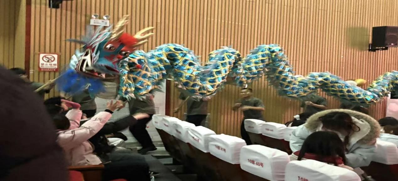 中场环节将汇演氛围推向高潮,学院志愿者们化身传递温暖的使者,手持精心准备的节日礼物,走到观众席间派送,欢呼声与喝彩声交织。祥龙穿梭至观众区与师生互动,观众们热情伸手触碰龙身,现场互动热烈,民俗韵味与节日欢乐交织。