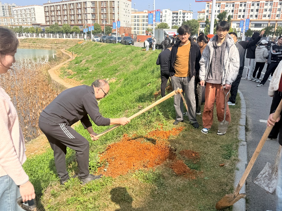 理论讲解结束后,活动进入热火朝天的实践环节。大家按照预先分组,几人结成一小队,迅速领取工具和花苗,投入劳动之中。现场气氛热烈而有序:有的同学挥锹挖土,有的扶苗填坑,有的踏土夯实,大家分工协作,默契配合。每一道工序都做得认真细致,每一个步骤都倾注了对绿色的期盼。