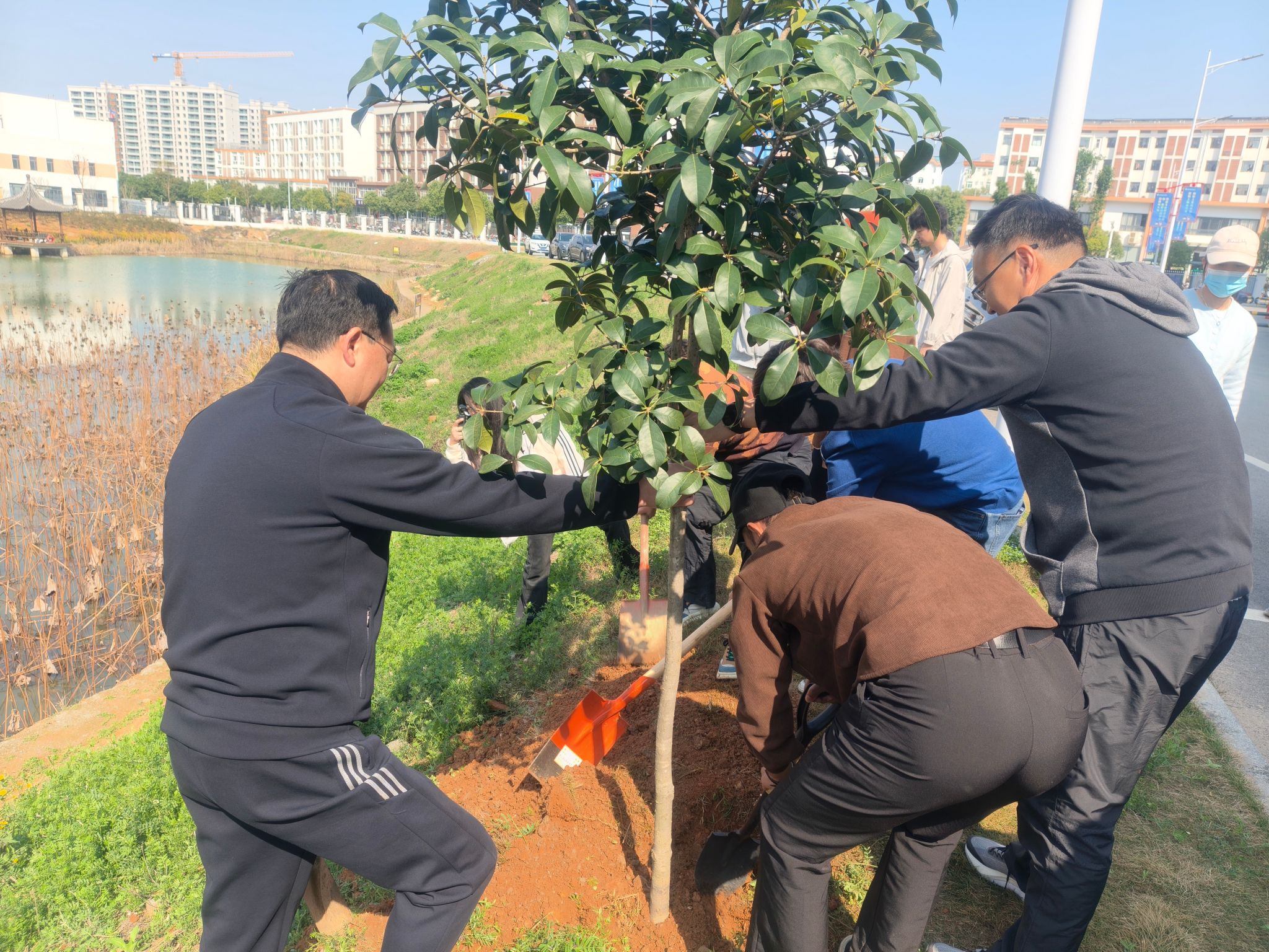 3月12日植树节,咸宁职业技术学院党委委员、副校长方高文,信息工程学院院长胡文杰、党总支副书记郑重、团总支书记余飞跃、辅导员朱芳和梅莹带领留学生开展义务植树活动,为校园增添绿意,为文明校园创建添砖加瓦。