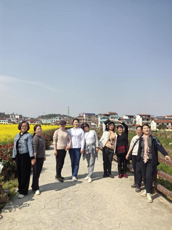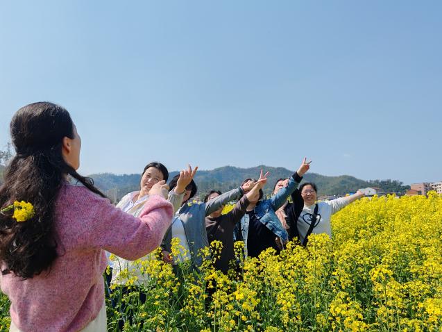 午后,队伍转场至高桥。这里,金黄的油菜花一望无际,与蓝天白云相互映衬,构成了一幅绚丽多彩的田园画卷。女教职工们穿梭在油菜花田中,感受着大自然的生机与活力。她们有的摆出各种姿势拍照留念,有的则闭上眼睛,深呼吸,尽情享受着油菜花的芬芳。在花海中,大家还相互交流拍照技术,学习剪影技巧,用镜头捕捉彼此最美的瞬间。女教职工们纷纷化身摄影达人,从不同角度、运用不同光线,记录下这如诗如画的田园美景和大家欢快的笑容。在交流学习过程中,不仅提升了拍照水平,更增进了彼此之间的情谊。