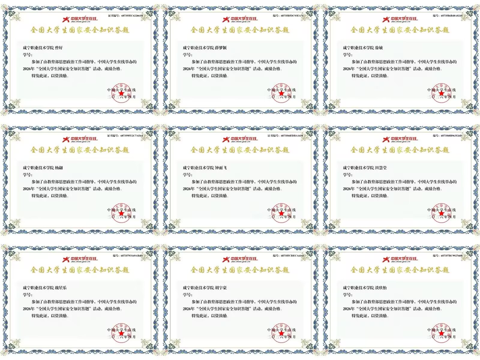 知识答题活动同步推进,我院积极动员学生参与“中国大学生在线”微信公众号答题活动,明确答题要求,鼓励学生以答促学、以学促行,切实巩固学习成果、提升安全素养,对答题成绩80分及以上的学生,及时提醒其领取电子证书,确保活动取得实效。