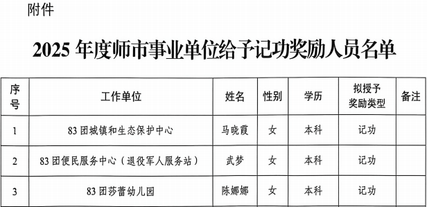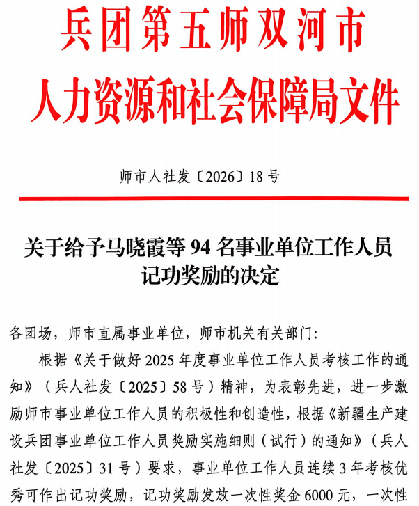 近日,新疆生产建设兵团第五师双河市人力资源和社会保障局发布《关于给予马晓霞等94名事业单位工作人员记功奖励的决定》,我院援疆教师徐群刚因连续三年年度考核优秀,荣获记功表彰。这是对他援疆期间辛勤付出与突出贡献的高度肯定,也是我院服务国家战略、深化东西部协作的生动体现。