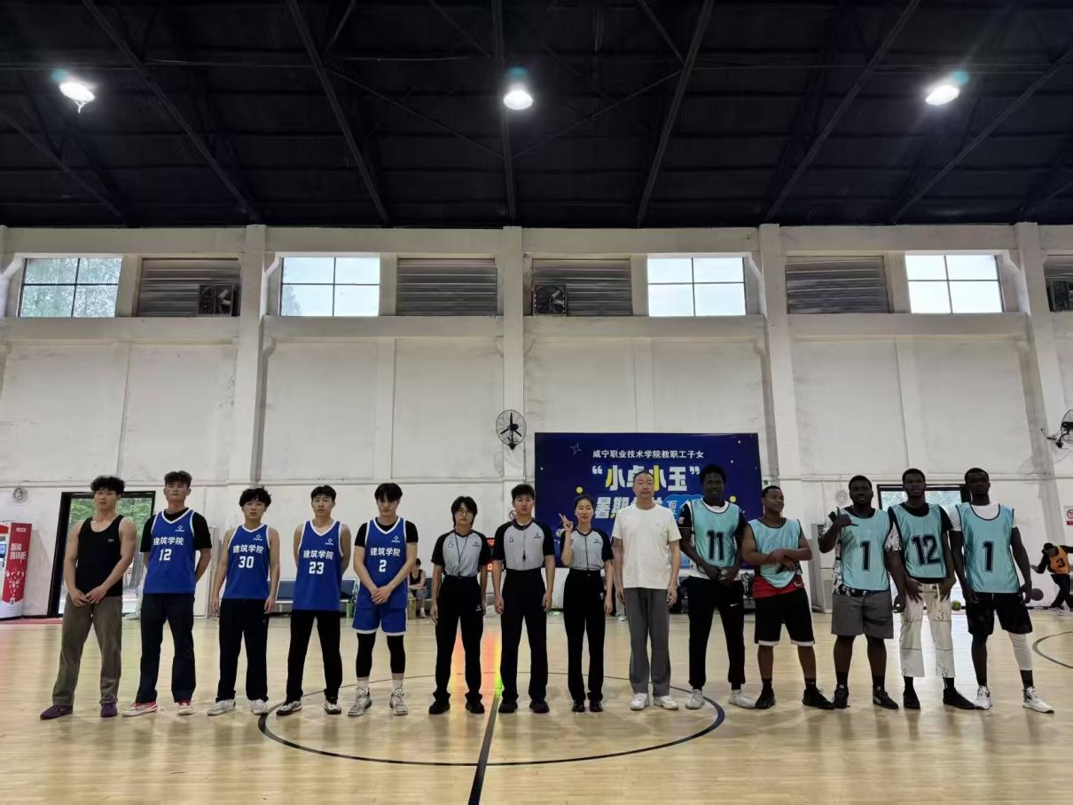 2026年4月22日下午,咸宁职业技术学院室内篮球馆气氛热烈,国际教育学院篮球队与建筑学院篮球队在此展开精彩对决。双方队员迅速进入状态,攻防转换节奏明快,突破上篮、三分远投接连上演,现场掌声不断。
