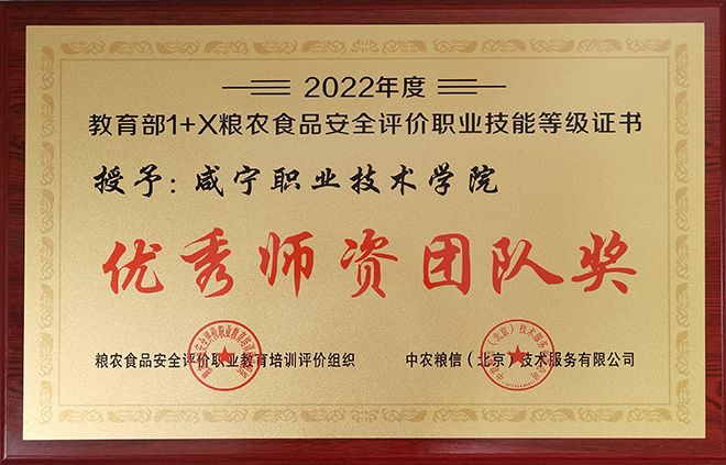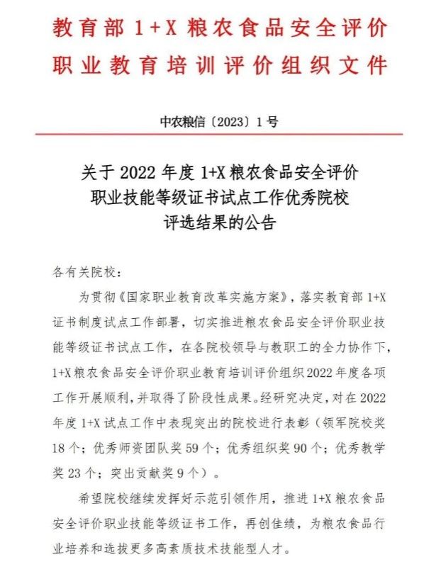 近日,从教育部1+X粮农食品安全评价职业教育培训评价组织中农粮信(北京)技术服务有限公司获悉,我校获评2022年度教育部1+X粮农食品安全评价职业技能等级证书试点工作优秀院校,荣获“优秀组织奖”和“优秀师资团队奖”。