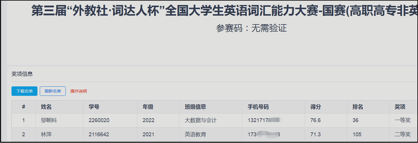5月27日,第三届“外教社•词达人杯”大学生英语词汇能力大赛全国决赛在线上圆满落幕。6月5日,喜讯传来:我校邬朝科和林萍同学代表湖北省参赛,并荣获国赛一等奖和二等奖的好成绩!