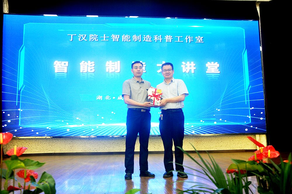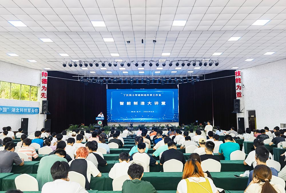 6月29日上午,丁汉院士智能制造科普工作室在我校大学生活动中心举办“智能制造大讲堂”。湖北省机械工程学会副理事长兼秘书长朱永平、咸宁市科协党组书记程朝阳、咸宁市科协主席王丹青、湖北香城智能机电研究院院长周国鹏、“科创中国”湖北科技服务团代表等嘉宾出席活动。