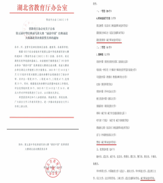 近日,湖北省教育厅办公室公布第五届中华经典诵写讲大赛“诵读中国”经典诵读大赛湖北省决赛比赛结果,我校师生在此次比赛中获得佳绩。学生朗诵作品《我们的青春》获职业院校学生组一等奖,教师朗诵作品《赞美》获教师组二等奖,学校获优秀组织奖。