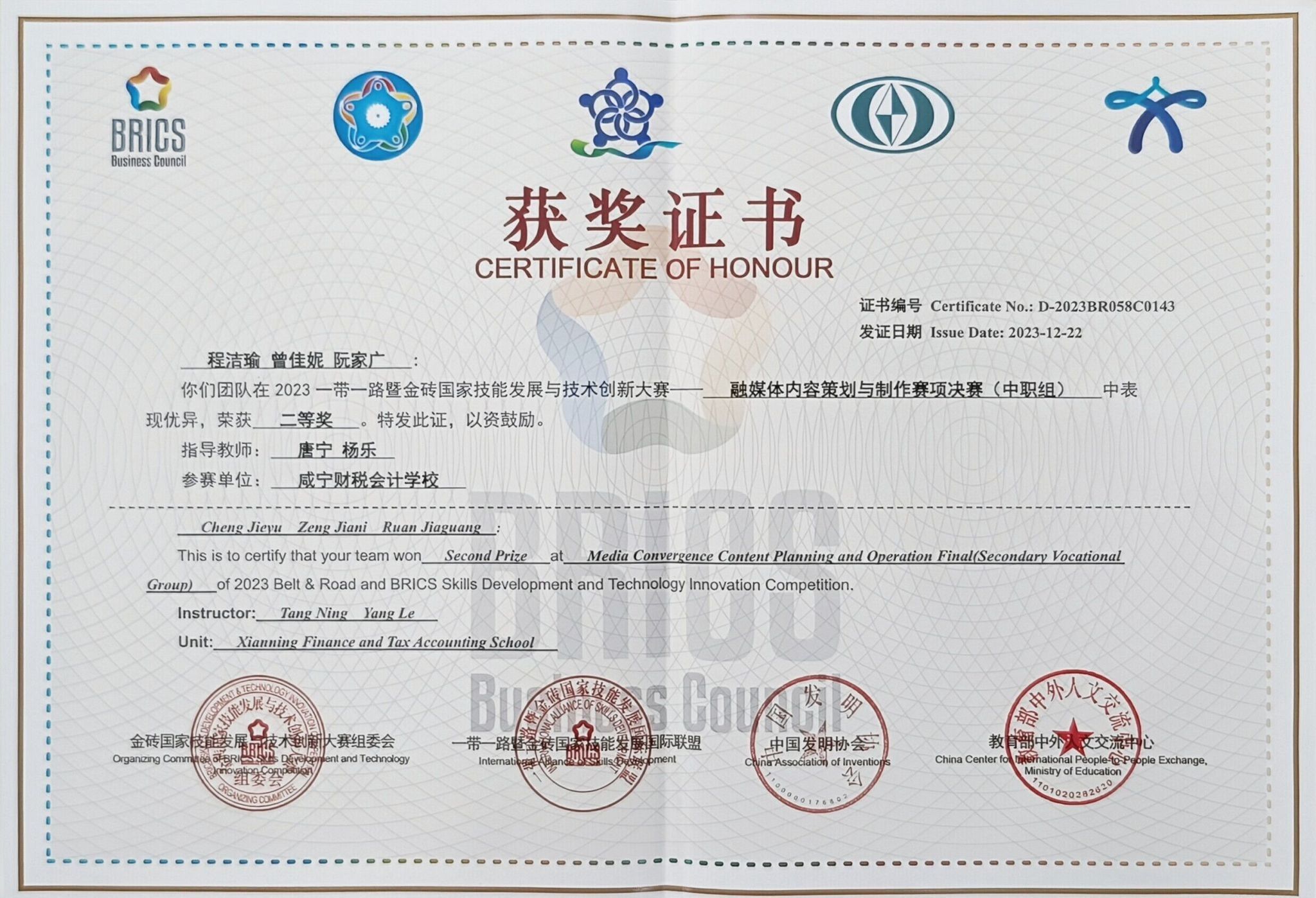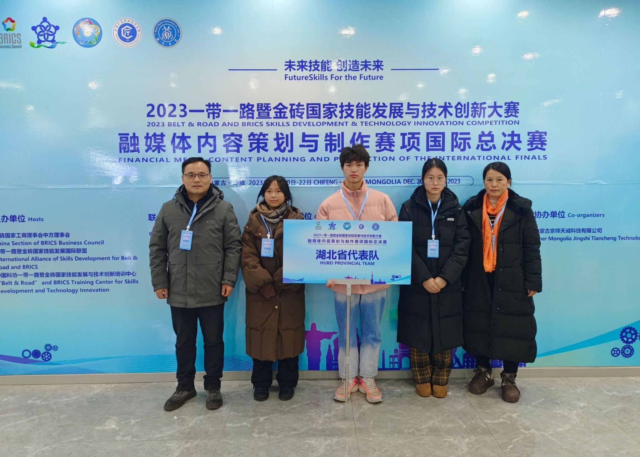 12月20日-23日,2023一带一路暨金砖国家技能发展与技术创新大赛——融媒体内容策划与制作赛项国际总决赛在内蒙古赤峰市松山区赤峰信息职业技术学校举办。经过激烈角逐,我校学生曾佳妮、程洁瑜、阮家广组成的湖北省代表队,荣获国内(中职)组二等奖,我校荣获“优秀组织奖”,唐宁、杨乐老师荣获优秀指导教师。