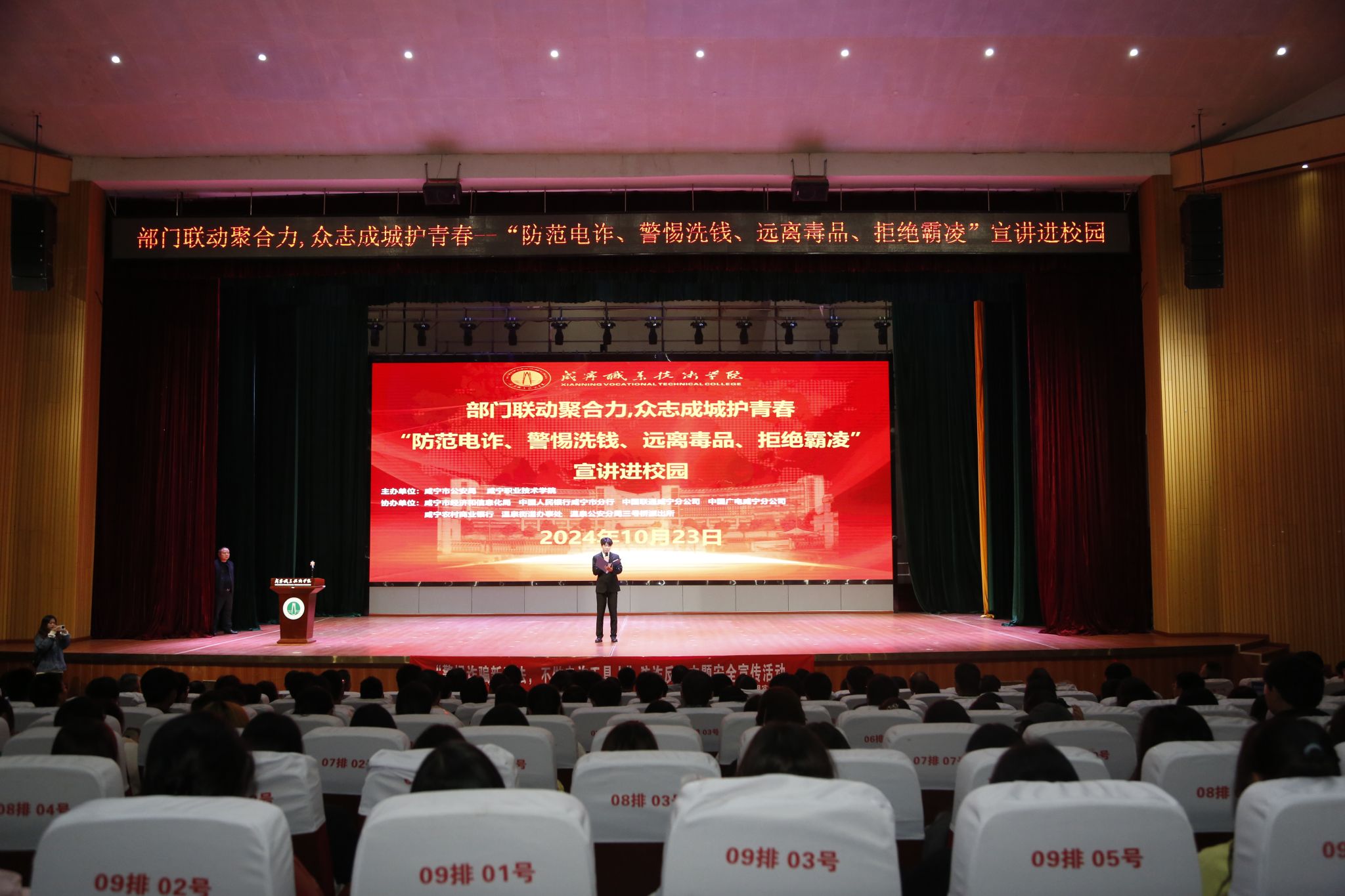 10月23日晚,咸宁职业技术学院联合咸宁市公安局开展防范电诈、警惕洗钱、远离毒品、拒绝霸凌主题宣讲进校园活动。