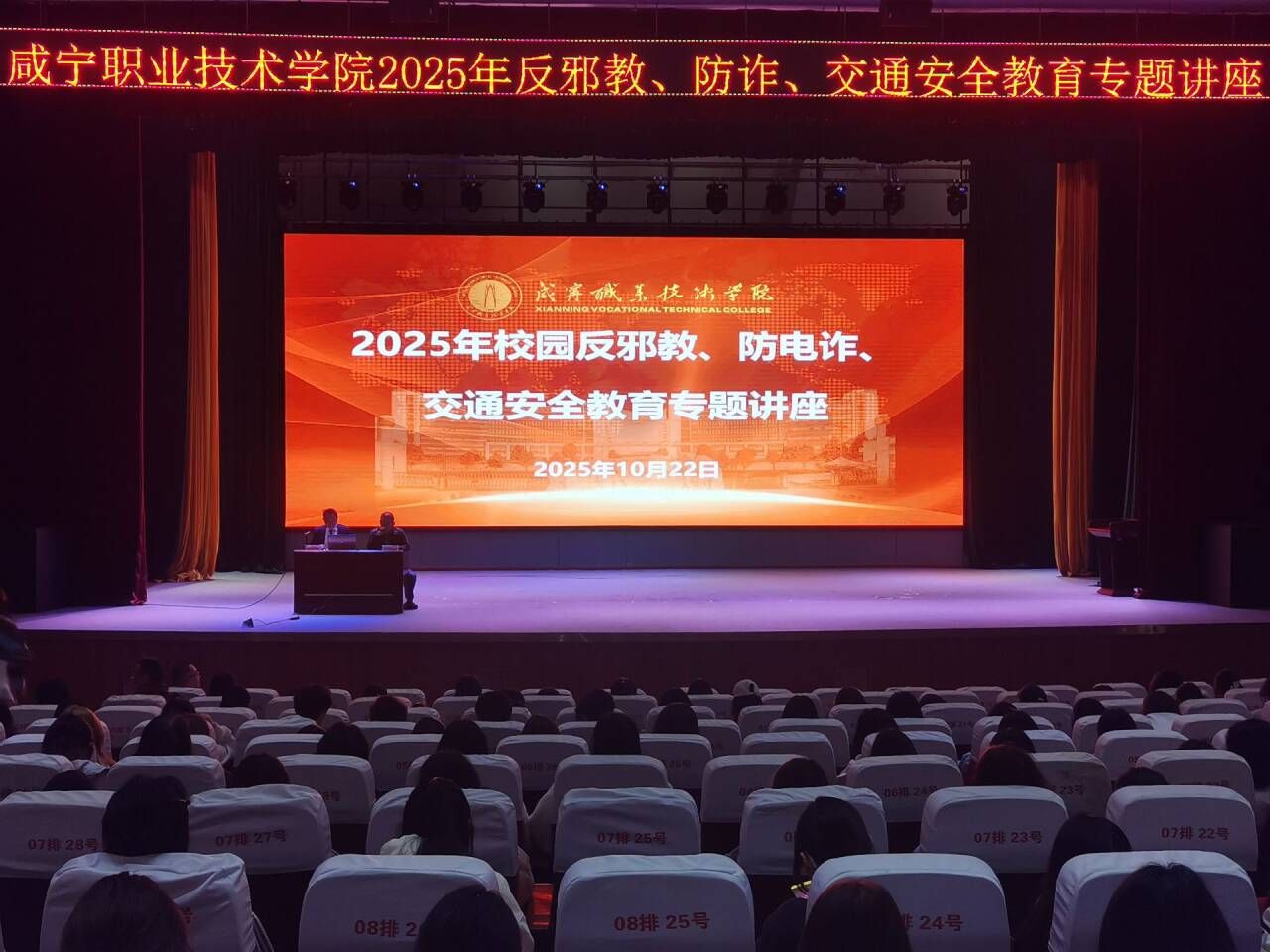 为进一步加强学生的安全意识,增强学生识别、抵制邪教的意识和能力,营造和谐稳定的校园环境,10月22日下午,湖北宁华律师事务所律师、咸宁市法学会副会长、我校马克思主义学院陈世月老师在科学会堂为1300余名学生代表开展反邪教专题讲座。讲座由保卫处处长熊柏祥主持。