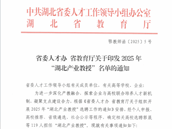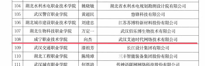 近日,中共湖北省委人才工作领导小组办公室与湖北省教育厅联合发布《2025年“湖北产业教授”名单》,咸宁职业技术学院成功聘任武汉艾迪时代网络技术有限公司技术总监向杰担任“湖北产业教授”。湖北产业教授的成功聘任是学校深入推进产教融合、强化校企协同育人的重要成果,标志着我校在构建“校企共建、资源共享、人才共育”的新型人才培养模式上迈出坚实一步。