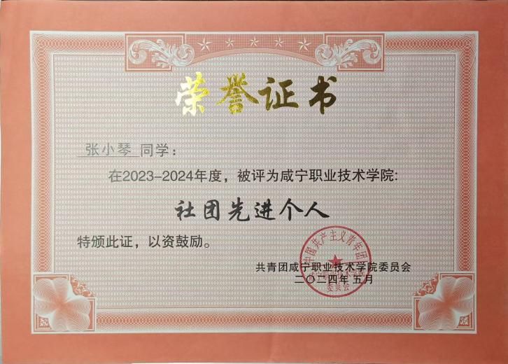 图13 张小琴获2024-2025年度咸宁职业技术学院社团先进个人