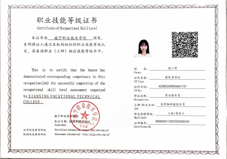 图1 张小琴同学考取农作物种植技术员等技能证书(三级/高级工)