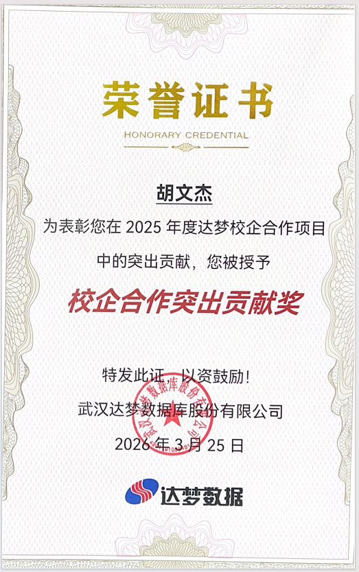 近日,武汉达梦数据库股份有限公司(以下简称“达梦数据”)公布了2025年度校企合作院校表彰名单,咸宁职业技术学院凭借在国产数据库人才培养与产教融合方面的突出表现,被授予“产教融合标杆院校”称号,信息工程学院院长胡文杰荣获“校企合作突出贡献奖”。