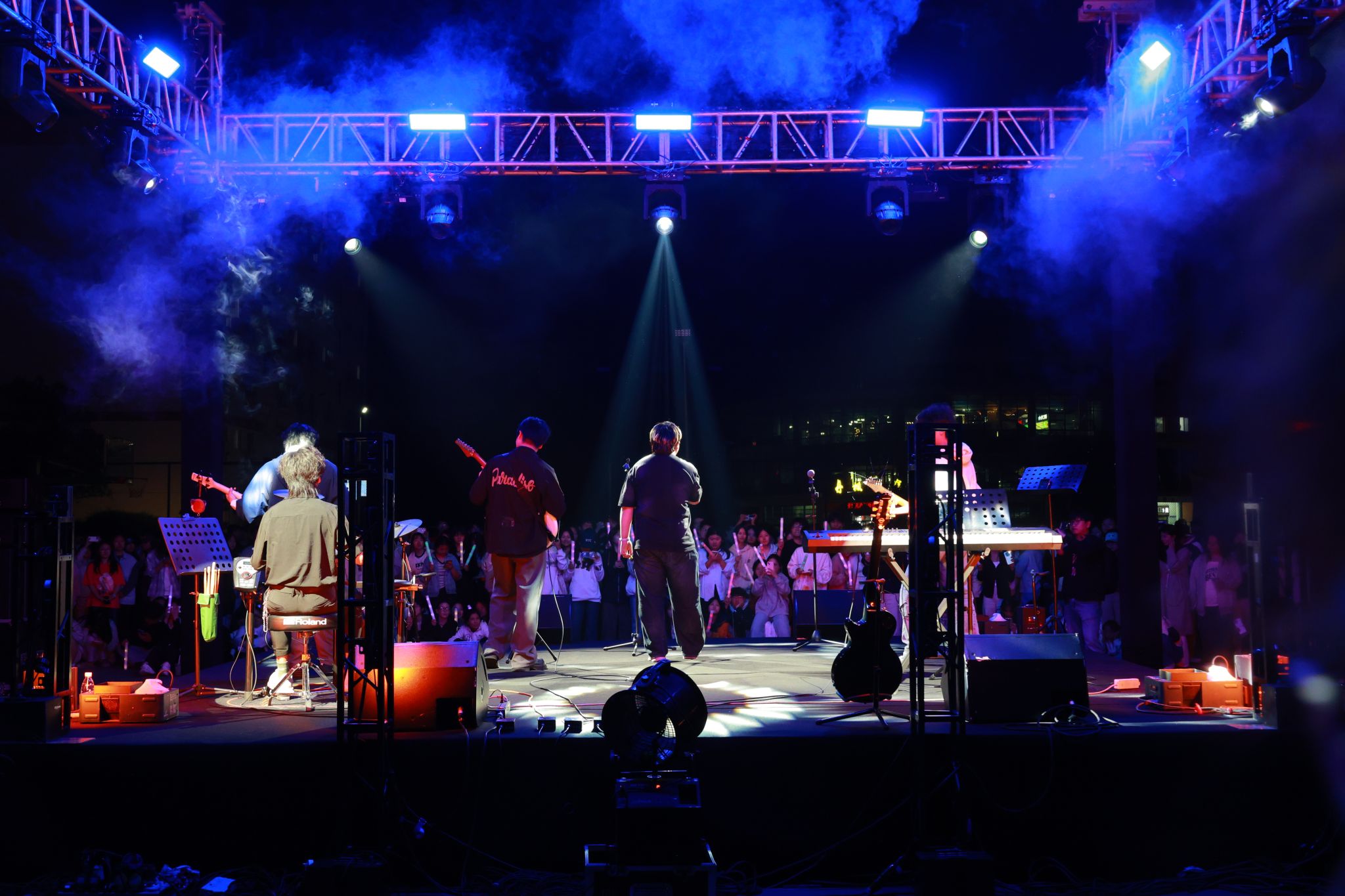 夜幕初垂,篮球场灯光闪耀,上千名学生有序落座、席地而坐,现场人头攒动、氛围热烈。活动伊始,学生演员们依次登场,带来民谣、摇滚、rap等多元节目,流行金曲、抒情民谣、动感乐曲轮番上演,悠扬的旋律、饱满的演唱、默契的配合,尽显咸职青年的艺术素养与青春朝气。每一个精彩节目都赢得现场阵阵欢呼,台下观众纷纷举起手机,打开闪光灯随音乐节拍轻轻摆动,点点星光汇聚成浪漫的海洋,全场沉浸在热烈、欢快、治愈的音乐氛围里。