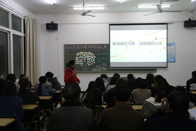 胡琳老师以习近平总书记在全国高校思想政治工作会议和全国教育大会上的重要讲话精神作引导,围绕“高校人才培养目标”,主要从“什么是习惯”“大学生常见的不文明行为习惯”“大学生形成不文明行为习惯的主要原因”“大学生如何养成文明行为习惯”四个方面阐述大学生文明习惯的养成。班会过程中,胡老师结合学校实际,具体从教室、食堂、宿舍和校园四个维度展示大学生在校存在的不文明行为;通过展示学生自编自导的情景剧《倒霉的一天》,告诫同学们要树立良好的时间观念,不迟到,不拖拉;通过实例分析,引导大学生要从身边的小事做起,从一点一滴做起,做文明人,行文明事。