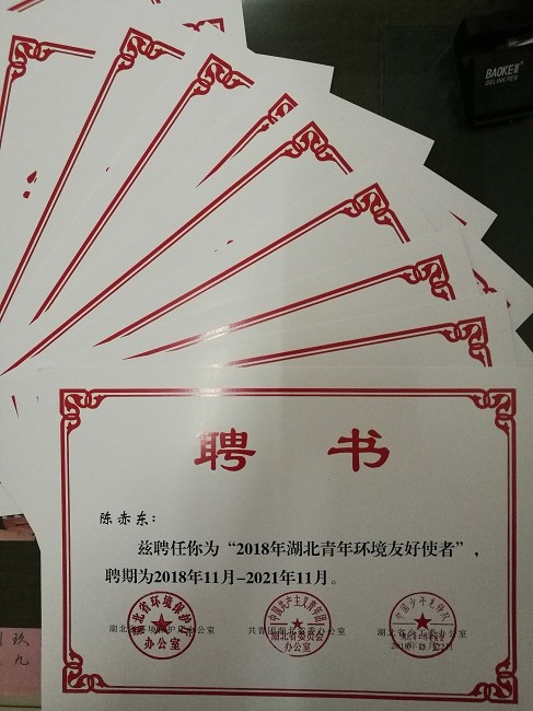 近日,从省环保厅获悉,我校学生社团联合会环保协会陈赤东、任倩倩、毛玉秋等15名学生获聘“湖北省青年环境友好使者”。聘期为2018年11月至2021年11月。