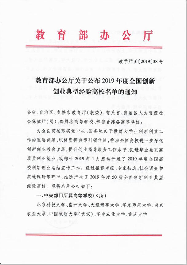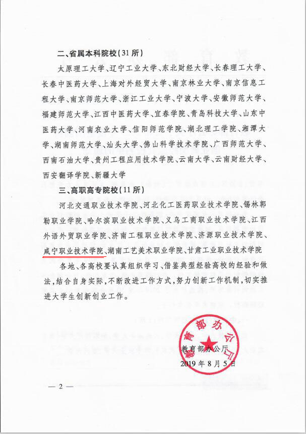 8月5日,教育部办公厅发布《关于公布2019年度全国创新创业典型经验高校名单的通知》(教学厅函〔2019〕38号),公布2019年度全国创新创业典型经验高校50强名单,咸宁职业技术学院成为本次评比中唯一获此殊荣的湖北省高职院校。