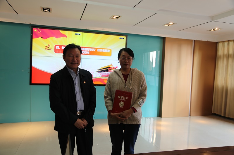 王继成同志为征文一等奖万兰萍颁奖