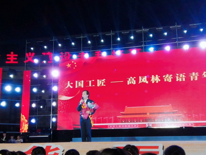晚会在大一新生的拉歌比赛中拉开序幕,尽显青春风采的拉歌让欢乐的氛围笼罩整个广场。首先欢迎四位大国工匠莅临我校,他们分别是全国劳模、大国工匠、中华全国总工会兼职主席高凤林;全国劳模、大国工匠、国家科技进步二等奖获得者郭晋龙;全国劳模、大国工匠、国家科技进步二等奖获得者王军;全国五一劳动奖章、全国三八红旗手获得者高少萍。高凤林先生作为代表寄语我校2019级新生,他希望同学们能够不忘初心,争做对社会有用之人。
