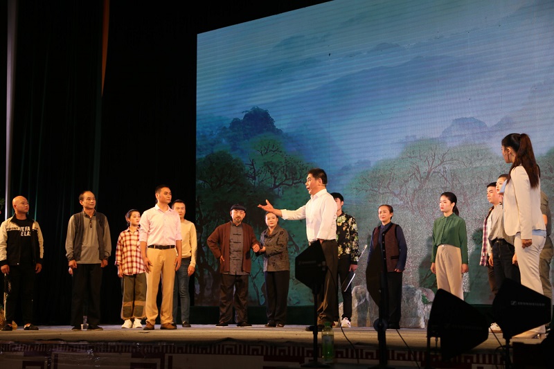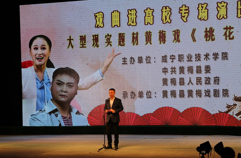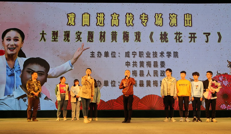 演出结束后,学生代表和咸宁黄梅戏爱好者上台与演员们同唱黄梅戏经典曲目片断,引来阵阵掌声和喝彩。
