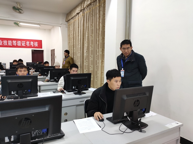 校长高焕清、副校长万齐元、副校长方旭、继续教育学院院长胡帅巡视检查了现场考核工作。高焕清认真巡视了两个考场的考务工作,仔细了解了“1+X”证书考核试点具体工作情况,并对后期推进工作进行了指导。他对建筑学院率先进行“1+X”考核试点以及目前取得的成绩表示赞赏,希望再接再厉,2020年继续在2018、2019级学生中推进考核工作。