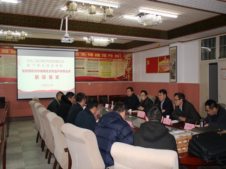 1月14日下午,教育部现代学徒制试点专业合作企业——湖北三赢兴电子科技有限公司向我校捐赠十万元的教学设备,捐赠仪式在信息工程学院会议室举行。三赢兴科技集团总经办主任何耀龙、三赢兴科技集团总监刘传福、咸宁公司人事行政部经理黄建军、通城公司人事部课长程开基,我校副校长方旭、信息工程学院党总支书记吴虓、行政负责人胡文杰等出席了捐赠仪式。仪式由吴虓主持。